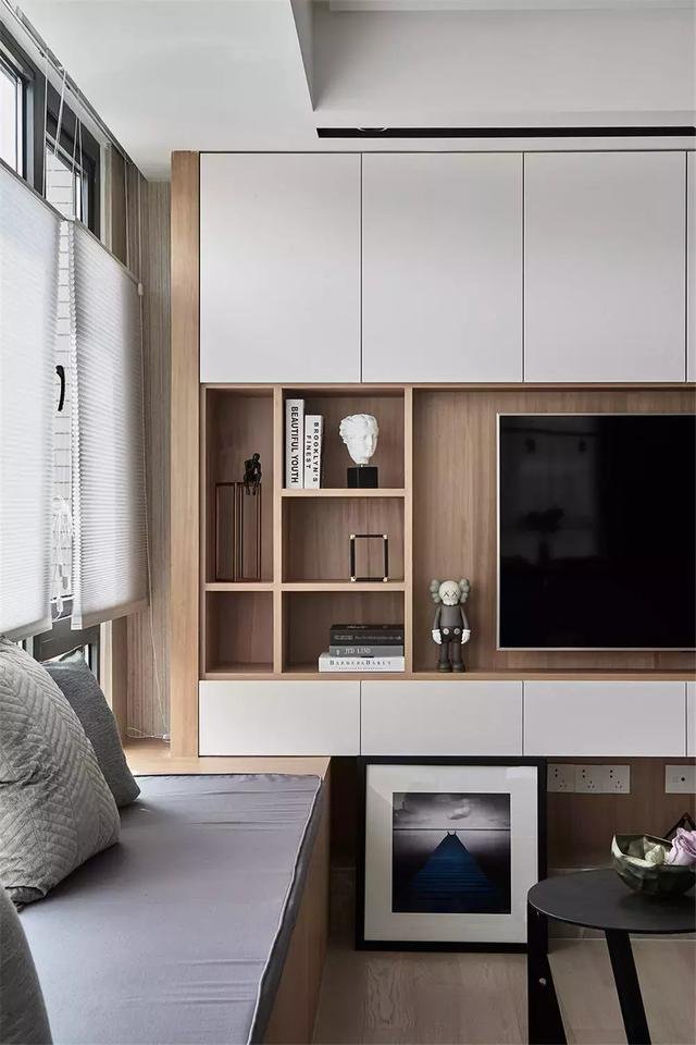 ▲ 收纳展示柜上布置了精致的书籍与小饰品,与壁挂电视机搭配出简约舒适的空间气息。
