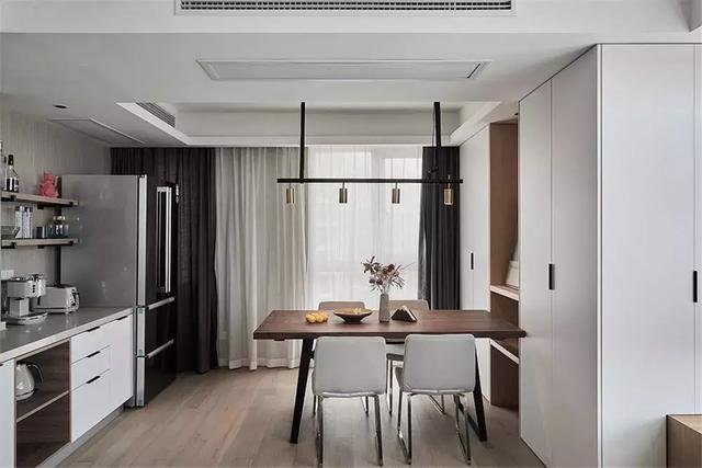 ▲ 餐桌旁的墙面设计了一个两侧封闭+中间开放式的餐边柜,杂物收于两边,装饰品或常用品放在中间,好看又实用。
