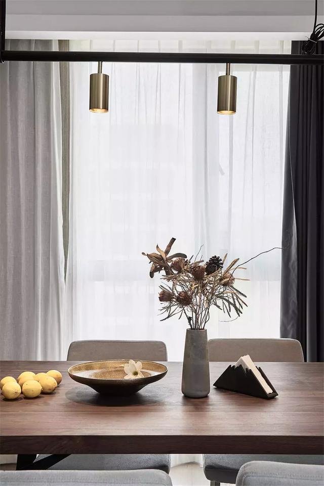 ▲ 铜色吊灯在黑色吊杆下,搭配餐桌上的摆饰,带来一个利落而精致的用餐氛围。
