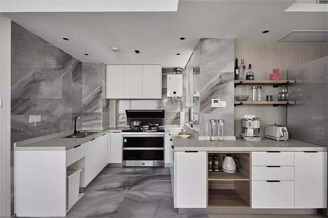灰色大理石质感的墙面、地面砖,搭配白色橱柜与黑色电器,简约又时尚。