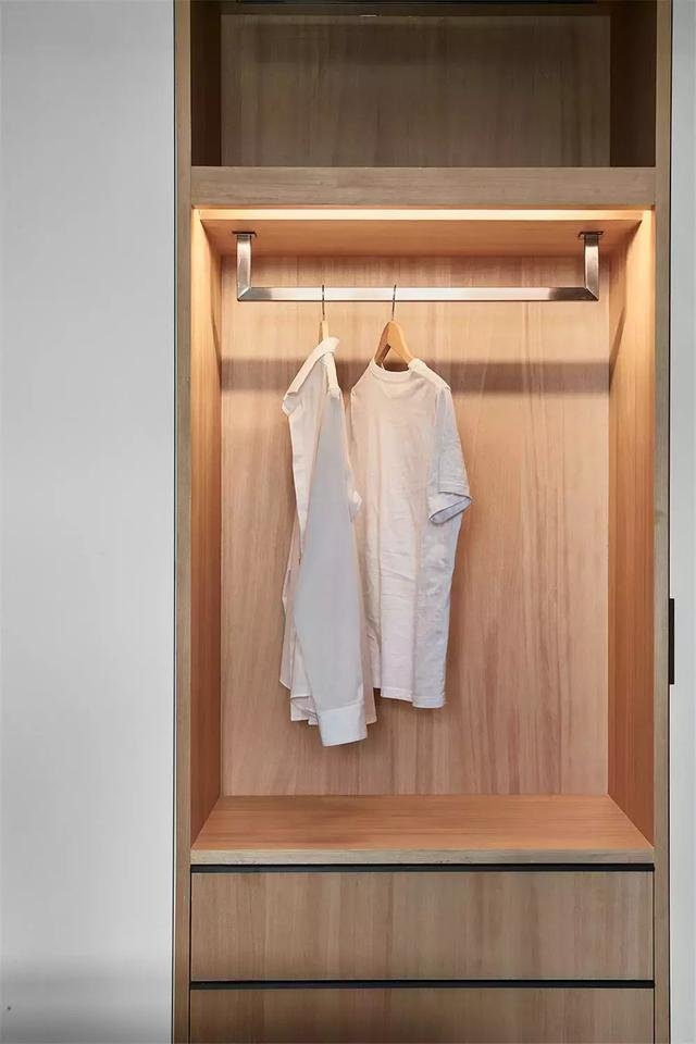 ▲ 顶天立地式的衣柜满足收纳需求,衣柜内部装了灯带,不用每次找衣服都在漆黑的衣柜里面翻箱倒柜了。
