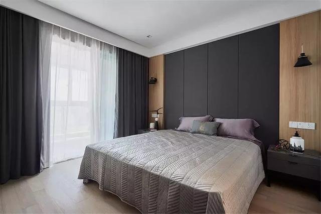 ▲ 床头两侧木色的墙面对称地装上了壁灯,结合灰色窗帘与床头柜颜色的相互映衬,让卧室显得格外的安静优雅。