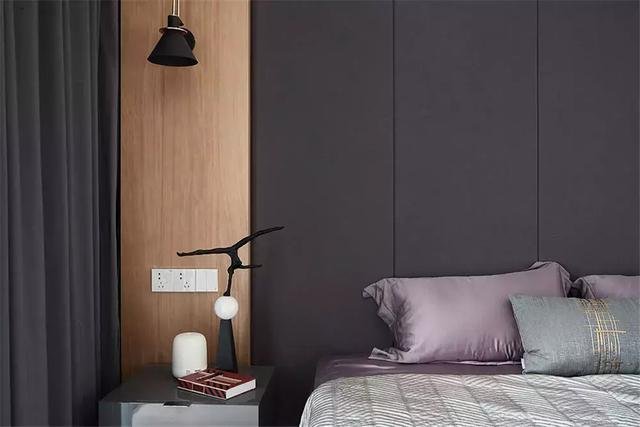 ▲ 卧室床头以灰黑色+两侧木饰面为背景,搭配侧边白色衣柜门,整体简约的空间在木色与暖光的衬托下,流露出温馨的氛围感。