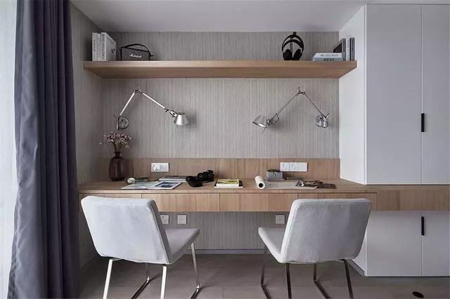 木色的悬空书桌与搁板,结合壁灯与侧边白色的收纳柜,整个空间简单自然又实用。