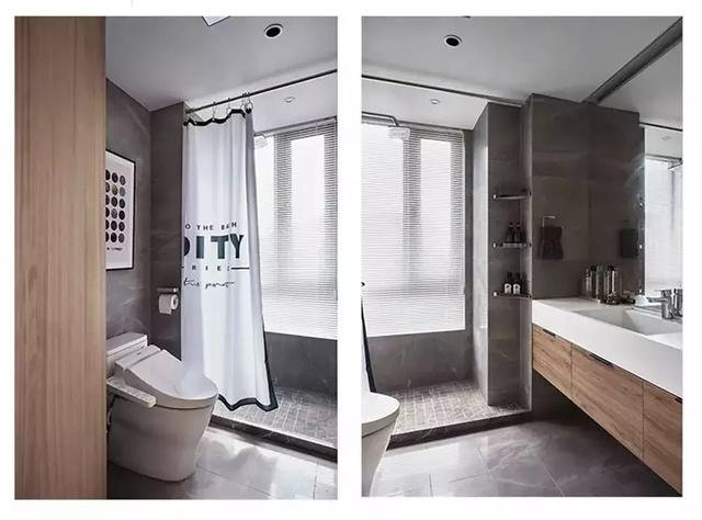 ▲ 卫生间整体为灰色调,配以木色的浴室柜,简约自然。以浴帘+挡水条进行干湿分离,实用与美观兼备。